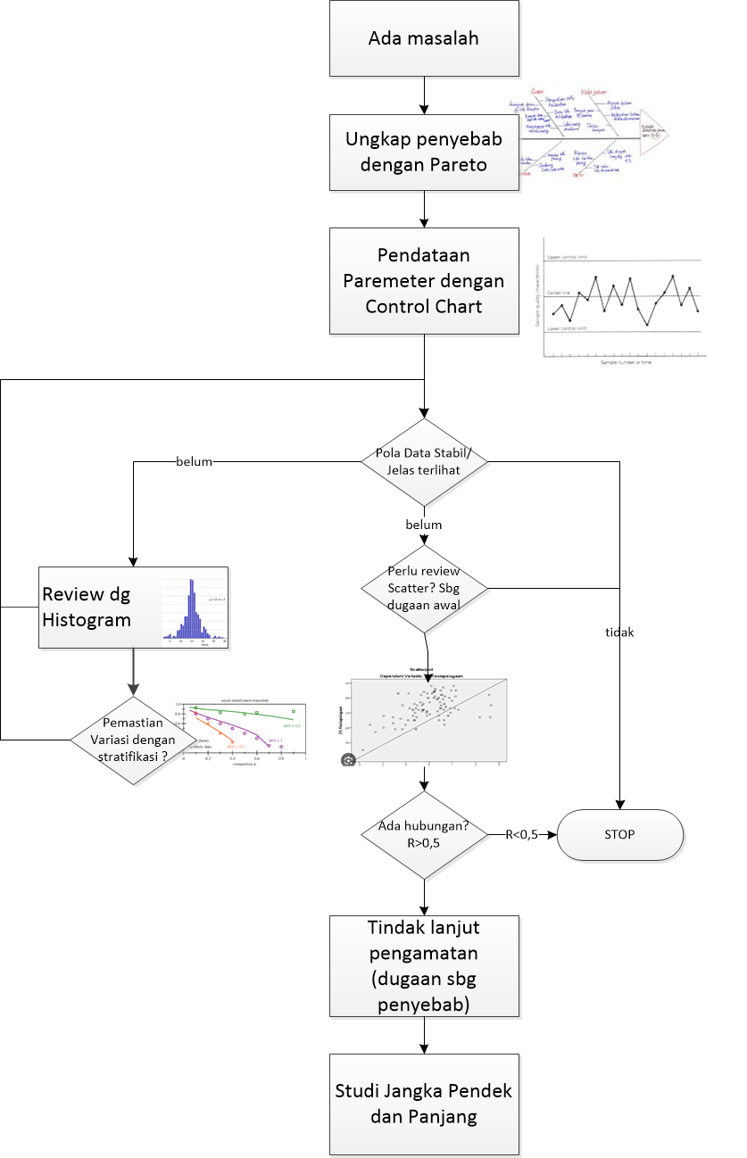 Penggunaan Pareto, Control Chart, Stratifikasi dan Histogram/Scatter dari pengalaman kami, adalah kombinasi tool yang jitu. Kenapa jitu? Ya karena pola variasi parameter-parameter kita bisa sajikan secara jelas.