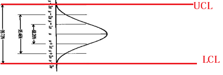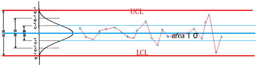 Bila kita bayangkan kedua garis itu merupakan garis kontrol data kita (UCL-LCL), maka data yang normal adalah jumlah datanya lebin banyak berada di daerah tengah. Bila dalam tampilan ini saya putar ke kanan akan terbentuk gambar seperti ini